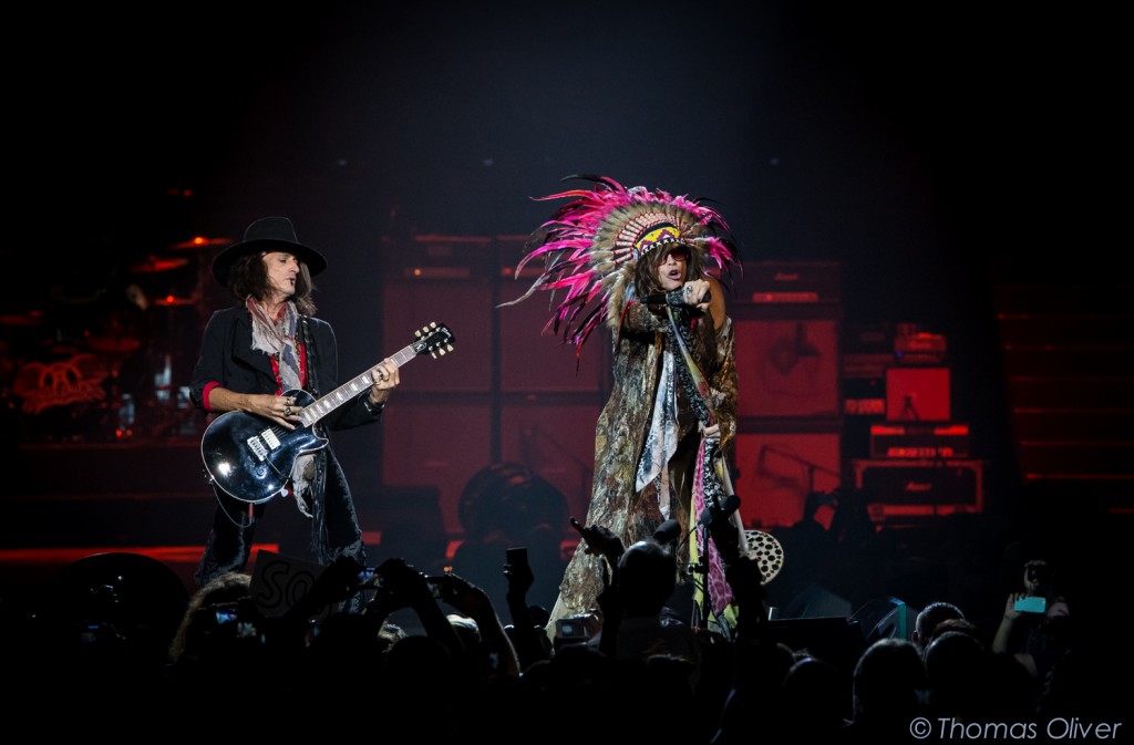Then, like an instant ominous presence beaming out over the crowd, the lights dropped to a booming audiovisual presentation on the screen. ‘Be prepared for music from another dimension’ bellowed over the speaker system. Smoke, thunder, flashing lights ensued, an Aerosmith logo was emblazoned on the floor of the stage – and then they emerged. Steven Tyler in an Indian headdress, oversized sunglasses and Joe Perry with axe in hand on the catwalk stage extension reaching through the crowd.
