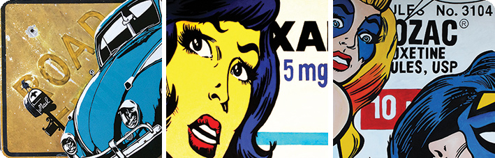 Mark’s work focuses on duality and the contradictory nature of man. Conflicting ideas are represented in vibrant colour for the viewer to interpret. Mark draws influence from the media and symbolism to create a narrative.