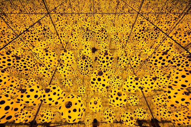 Other highlights include I WANT TO LOVE ON THE FESTIVAL NIGHT 2015, an immersive hexagonal installation with external and internal mirrors and a floor of multi-coloured flashing lights and THE SPIRIT OF THE PUMPKINS DESCENDED TO THE HEAVENS 2017, a mirrored cube installation visitors can peer into where the internal reflections create the impression of a vast field of luminous gourds.